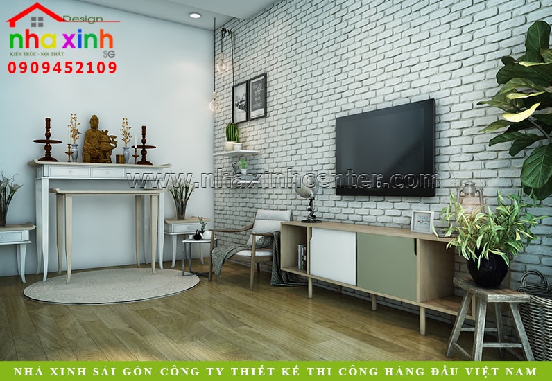 Phòng sinh hoạt với các cậu cây trang trí đẹp mắtSở hữu riêng cho gia đình một không gian sinh hoạt khá là rộng rãi với đầy đủ sự tiện nghi bên trong, nhằm đáp ứng phục vụ mọi nhu cầu giải trí, thư giãn của cả gia đình. Bước vào phòng này chắc có lẽ vách tường cuối phòng sẽ gây cho người đọc cảm nhận ấn tượng đầu tiên, để lộ gạch trần bê tông không phủ sơn, giản dị thôi nhưng cũng thuyết phục được hàng nghìn người chiêm ngưỡng với mẫu thiết kế đơn giản này. Bạn hãy thử nhìn vào căn phòng, mọi thứ dường như có một sự sắp đặt sẵn vì thế mà khi bước vào trong ta không hề có cảm giác bị choáng ngợp, lộn xộn. Một góc thờ tâm linh được đặt cuối góc phòng, thu nép vào một bên rất là gọn gàng.