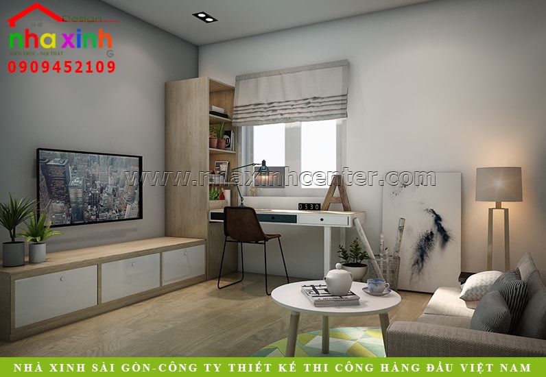 Nhìn về góc còn lại trong gian phòng đã được thay đổi bằng một lớp sơn màu xanh, nhẹ nhàng, thư thổi một làn gió tươi mát vào trong căn phòng này vậy. Âm vào tường bằng những dãy kệ trưng bày thật là khéo léo, ta chỉ cần 3 thanh gỗ xếp song song đơn giản thôi nhưng cũng đủ sở hữu cho riêng mình cho một kệ trưng bày thật gọn gàng mà không cần đến kiểu cách phức tạp. Những bức tranh treo trên tường hẳn là một trong những phong cách, Gu thẩm mỹ của chủ đầu tư đã lựa chọn nên, bạn có thể tự do thoải mái trang trí căn phòng theo sở thích của bản thân chính là điều mà không phải xu hướng nào cũng làm được. Điểm vào phòng bằng đôi ba chậu cây xanh như góp chút sắc tự nhiên làm giàu cảnh quan vui tươi nơi đây.